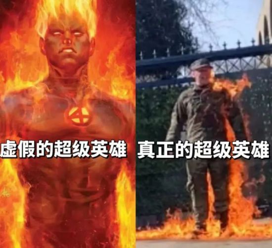 我看了不打码视频,来回看了数遍。他遗言从容,话也不多,自己倒油,自己点火,带好军帽,打火机被汽油打湿点了几次没点着,再加上风还有点大,似乎想挽留他。但他继续点,点了几次最终点着,火焰遂扑满他全身。