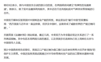 像耶伦这样的美国的高级官员,每次来都会在中国社会掀起不小的舆论交锋。我们说中国社会的心态,无论对美的斗争和妥协,其态度是复杂的。你要说,现在的中国,坚决主张和美国打一场,死里求活,这应该不是中国社会的主流心态。绝大多数中国人还是希望和美国做买卖的。但要说,为了达成和美国的一时妥协,真的自我阉割,放弃关键性的产业升级,那恐怕全国人民也不会答应。