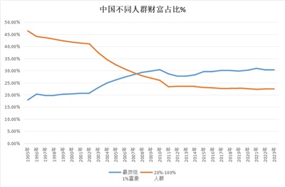 从2008年开始,占中国人口1%的最顶级富豪(蓝色)财富占比总和超过了占中国人口80%的劳动人民(橙色)所占有的财富总和。也就是说,1400万的中国顶级富豪的总财富超过了11.2亿中国劳动人民的财富总和。