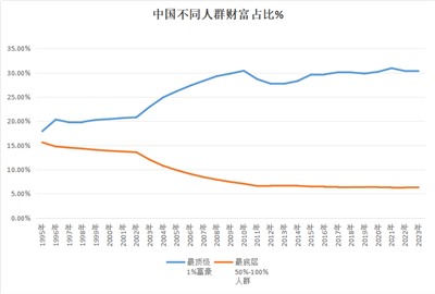 占中国人口1%的顶级富豪(蓝色)财富总和超过了占人口50%的劳动人民(橙色)的财富总和: