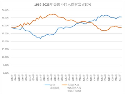2005年后,占美国人口1%的顶级富豪的财富更是超过了占美国人口90%的劳动人民财富的总和。如下图: