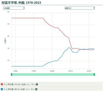 从2017年开始,占中国人口1%的最顶级富豪(蓝色)财富占比总和超过了占中国人口88%的劳动人民(橙色)所占有的财富总和。也就是说,1400万的中国顶级富豪的总财富超过了12.32亿中国普通劳动人民的财富总和。