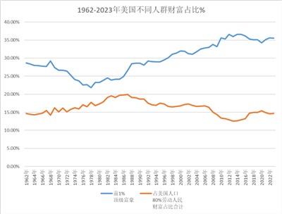 占美国人口1%的顶级富豪的财富(蓝色曲线)超过了占美国人口80%的劳动人民财富的总和(橙色曲线)。如下图: