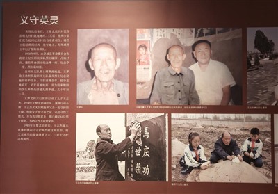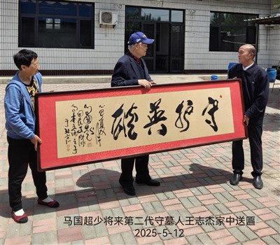 马本斋的儿子马国超少将,这些年已说不清来过这个陵园多少次了,今年是抗战胜利80周年,他满怀深情地写了“守护英雄”,并亲自到装裱店做成牌匾。5月12日,他带着我们四人,驱车来到纪家庄,把匾送到第二代守墓人王志杰家中,场面非常感人。