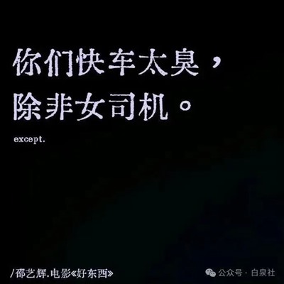 像《好东西》中的那句台词“快车太臭,除非女司机”所体现的逻辑那样,这种连打车也持有性别叙事的群体其实有一个很明确的,但自己可能不愿意承认的诉求,就是对购买来的社会服务的要求很精致,标准很高。只不过在当下流行的某种性别叙事中,这种精致和高标准可以和“美好的性别品质”挂勾。并非是因为这个司机是女性而被无条件认可,而是性别叙事假设“因为她是女性,所以她可以干净精致服务好”,所以才被认可。