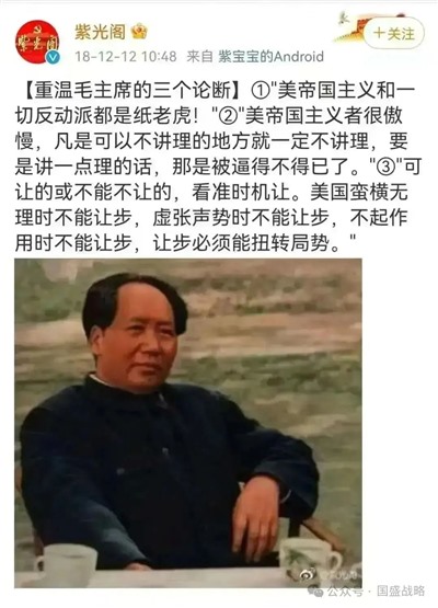 要清楚地认识到,越不想与老美搞关系,越能搞好中美关系,越想着与美国搞关系,越搞不好中美关系。这个就是辨证法!要相信美国就是纸老虎这一判断。中国面对美国要有战略自信和战略定力!就是我们的战略思维不够。在关税战中国占据优势的情况下,过早与美国签协议实际就是在救特朗普,也让中国对美筹码减少。中国本应利用持久战打到美国中期选举,那时特朗普为了选举,就会对中国做出更多让步,那时中国可以用更多筹码换得更多中国利益。本来中国借着特朗普的战略误判让中国占据优势的情况下,应是将中美博弈由战略相持转到战略反击的机会,现在过早与美国协议,让特朗普缓过气来,中美博弈则又回到战略相持阶段。美国必然在其残存的世界霸权地位优势,对中国马上进行反击,并利用霸权余威对其他国家施加压力,切断中国与其他国家的经济技术合作。