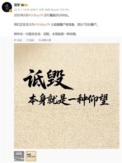 儿童节上午10点,小米董事长雷军在微博公布上个月小米su7汽车交付量,还表示刚学会一句莫言名言:“诋毁,本身就是一种仰望。”