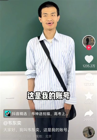 北大数学教师韦东奕在社交平台开短视频账号的事,引发了广泛关注。韦东奕的账号尽管只发布了一条时长4秒钟打招呼的视频,却在很短的时间内吸引了2000多万人关注。