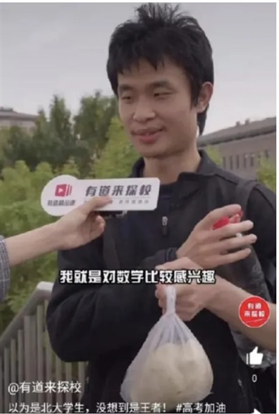 韦东奕最初走进公众视野,是因为他在一段探校采访中,一手拎着两个馒头,一手拿着似乎是反复使用的矿泉水瓶,穿着简朴、不善言辞,这与他拿过无数金奖的北大数学青年助理教授的形象形成了巨大反差。