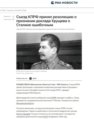 2025年7月,俄共决议彻底推翻了1956年苏共二十大上赫鲁晓夫的秘密报告。