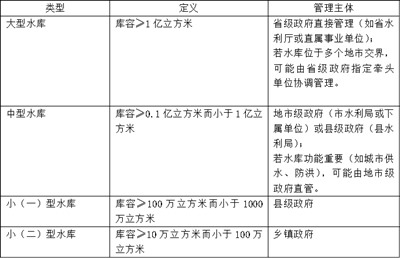 国有水库依据《水利水电工程等级划分及洪水标准》(SL252-2000),划分不同大小的水库并由不同层级的政府部门管理(如下表)。