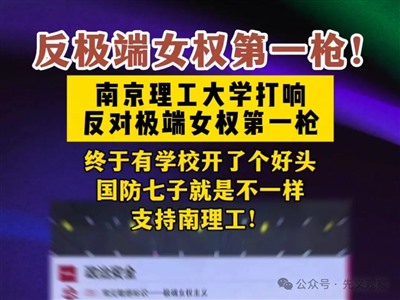 到底无愧是百姓喜爱的“国防七子”,南理工英勇地扛起了反对西方对我思想殖民的大旗,这第一枪,在社会反响异常强烈,引起极强烈的社会共鸣,因为他说出了社会对大学的期待,也说出了无数家长对孩子送进了大学以后成长的担心,更害怕这些极端女权主义会害了孩子们一生。但是,在广大师生和社会一片叫好中,有极个别人坐不住了,有人开始了对号入座,对南理工的这第一课开始无底线的责难。