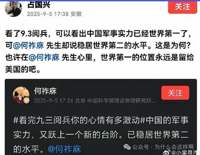 可是今天,中国具有了无可争议的最强的军事科技力量,但是今天的中国,却有极大数量的人心理上处在一个“不战而屈”的位置上,就包括某个“院士”,在9.3阅兵之后,以一种心不甘情不愿的态度说,中国终于第二了。