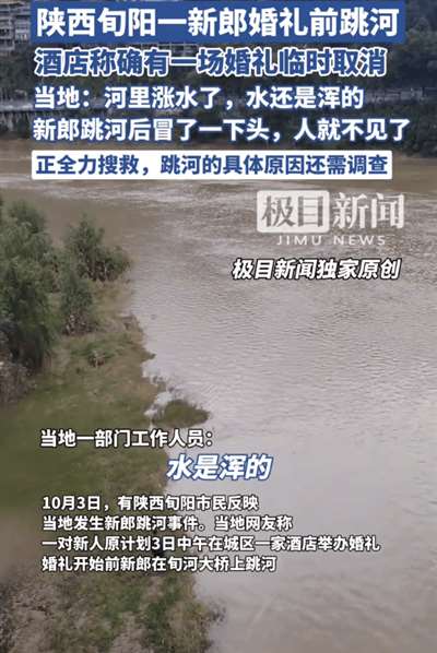 10月3日陕西旬阳市融媒体中心通报—— “2025年10月3日,旬阳市一男子在小河北旬河大桥跳河失踪。经公安机关初步调查,跳河男子为周某某,现年29岁,系旬阳市吕河镇居民。10月3日该男子因婚礼琐事情绪失控,10时许从婚礼酒店门口跑至旬河大桥跳河落水。旬阳市当即组织应急、公安、消防、海事等部门全力搜救,后续调查及家属安抚工作正有序开展。我们呼吁广大网友,依法理性表达观点,不轻信、不传播谣言。”