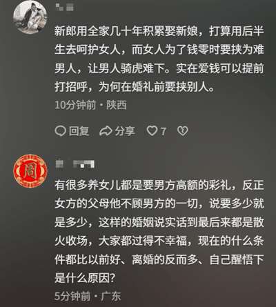 大家再次把矛头指向彩礼,指向了新娘,指向了女方。但彩礼大家都要,都要这么多,就是这个规矩,婚礼都是这么办的,怨新娘吗?怨新娘的娘家人吗?你看人家煤老板家海南的一个婚礼花了上亿元,影星马尔代夫的婚礼动辄几千万呐。这算个啥,要的多吗?