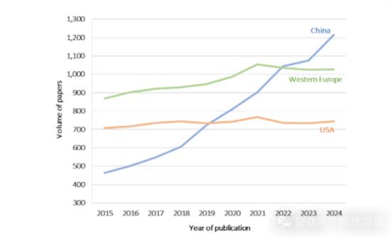 2015年至2024年中、美、欧的论文产出量对比。 数据来源:Scimago