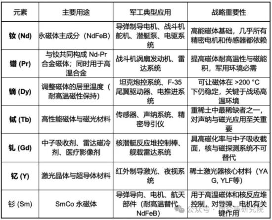根据网上资料,被美国政府归为“对国家防务不可或缺(essential for national defense)”的稀土元素有7种(见以下列表),它们是:Nd, Pr, Dy, Tb, Sm, Y, Gd,其中,前四种(Nd、Pr、Dy、Tb)常被称为“战略四要素”(Strategic Four),直接关系永磁体产业链,也是中国出口管控重点。