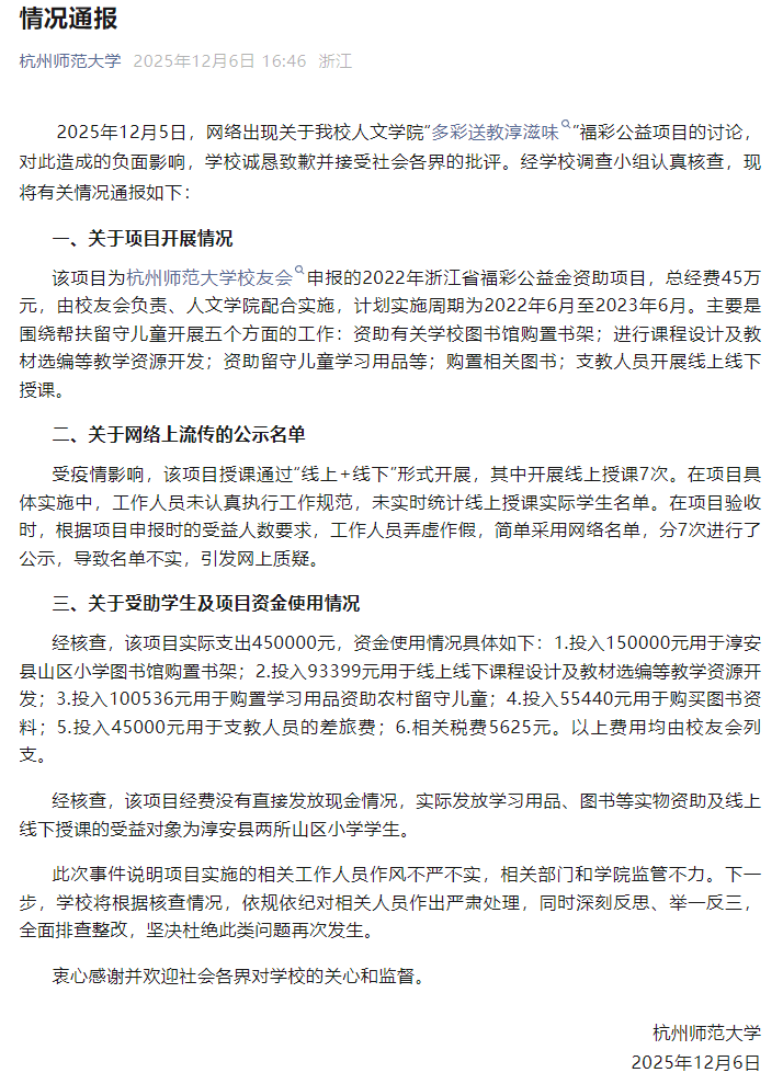 杭州师范大学福彩公益项目公示名单人员名字来自《10000中国普通人名大全》,该大学很快组成调查组,并给出调查结果: