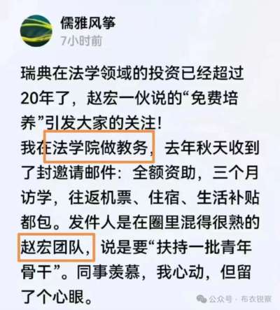 而网友“儒雅风筝”以亲身经历披露了一个更加令人不安的情况:非亲华国家瑞典在我国法学领域对人权等方面的投资已经超过20年,而北大赵宏团队试图以全额资助年青学者访学瑞典为名,协助瑞典渗透国内法学教育与学术领域。