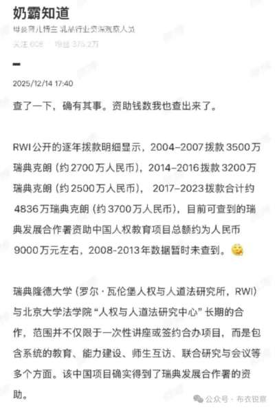 但同时瑞典罗尔.瓦伦堡人权与人道法研究所官网原文及北京大学法学院官网原文也被网友扒出,基本上给北大法学院等一年小1000万,这尼玛瑞典诺贝尔奖“偏心”不给中国,可这为了协助中国“教育驯化”持西方价值观者真下血本。