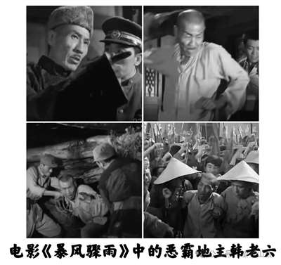 作为广大贫农阶级的对立面,小说着重展示了恶霸地主韩老六这个地主阶级的代表人物形象。韩老六靠依附官府对农民巧取豪夺而发家,是不折不扣的为富不仁;伪满时代,他当过伪区长,成为日寇的爪牙,是货真价实的汉奸;他又与山林中凶残的土匪互相勾结,利用它们残害掠夺乡里,是杀人不眨眼的黑恶势力;共产党来了,他让儿子逃去国民党军,并与国民党特务暗中联络,是妄图复辟的反革命。在村里,他欺压百姓,强抢、奸淫妇女。“他常常提根大棒子,遇到他不顺眼不顺耳的,抬手就打”,“韩大棒子的名声就此传开了”。这个韩老六,可以说是剥削阶级反动残暴性质的集中表现。