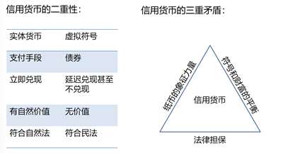 以上历史诞生了政治经济学的第三代模型——信贷理论,其重心即是信用货币的二重性。信用货币是介于实体货币和虚拟符号之间的一种货币,可以说同时拥有实体货币的即时支付功能和虚拟符号的信贷功能,所以也同样具有支付手段和债券两种不同交易方式,是立即兑现和延迟兑现甚至不兑现的结合。纸币本身虽不具有自然价值,但由于其二重性,纸币的自然价值可通过纸币可兑换的金属货币的自然价值反映出来,所以其自身也是自然价值和无价值二重性的矛盾结合。