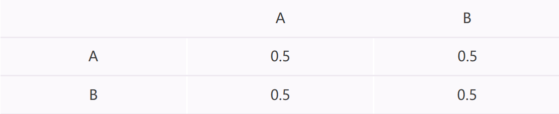 现假设一个二元一阶马尔可夫过程,小球在状态A和状态B之间随机改变的概率相等,转移矩阵表示小球从当前状态向下一状态转变的概率: