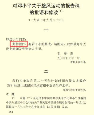 邓小平的《关于整风运动的报告》,毛主席做过批示,认为这个报告“很好”。