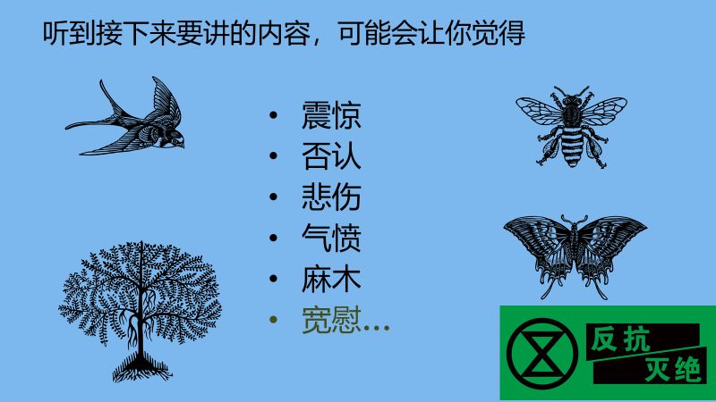 可以用一个生活中的例子做比喻,当病人被告知得了癌症之后,病人的反应可能是否认,觉得这不是真的;然后愤怒和悲伤,不明白为啥会落到自己头上;然后可能会麻木,反正也没有办法了,破罐子破摔……;同时,同样奇怪的是,也可能会有一种解脱感,因为,其实在我们内心深处,我们知道问题的存在,直到有人真的把问题说了出来,这带来了一种解放的感觉。在英国,很多“反抗灭绝”运动的成员的切身感受是:当行动起来之后,这本身带来了一种心理疗愈。