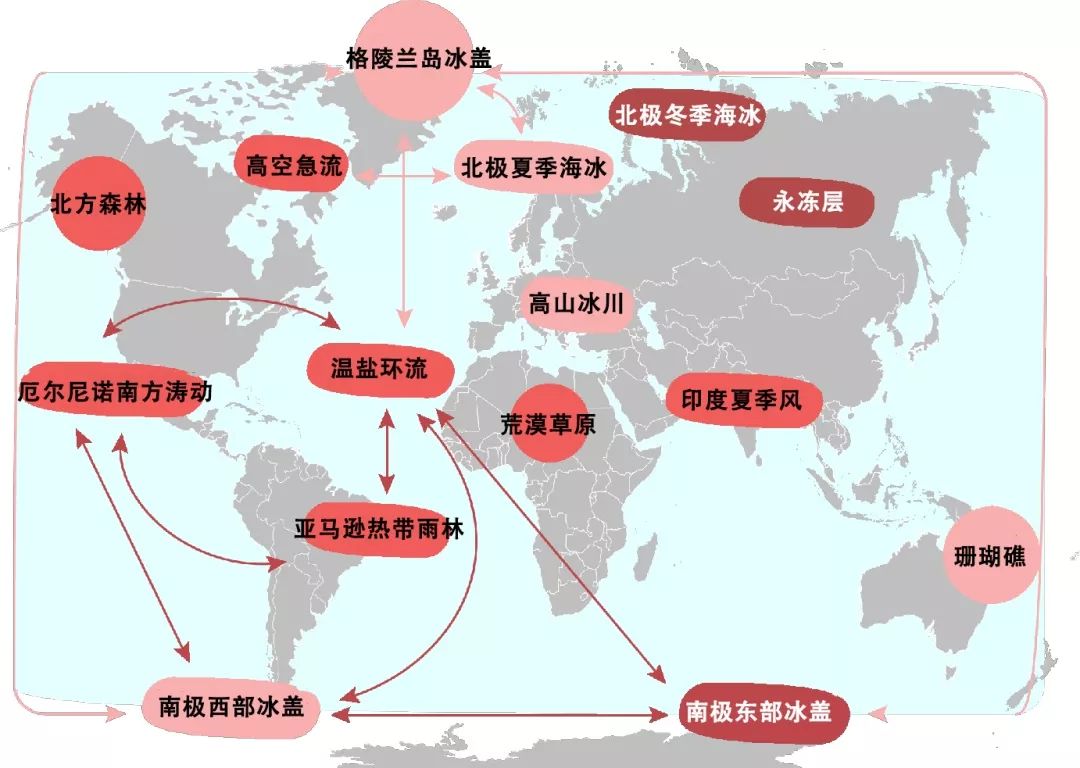 6)亚马逊热带雨林(Amazon rainforest):频发发生干旱。森林砍伐和环境变化在破坏亚马逊热带雨林的稳定性,亚马逊热带雨林是全球最大的热带雨林,已知的生物品种中,十分之一生存在这里。原来估计,当亚马逊雨林被毁坏40%是其生态系统崩溃的临界点,现在认为是20%。而从1970至今,雨林面积已经损失了17%。在这里,野火和气候反馈机制交互作用,形成可信的预测模型并不容易。
