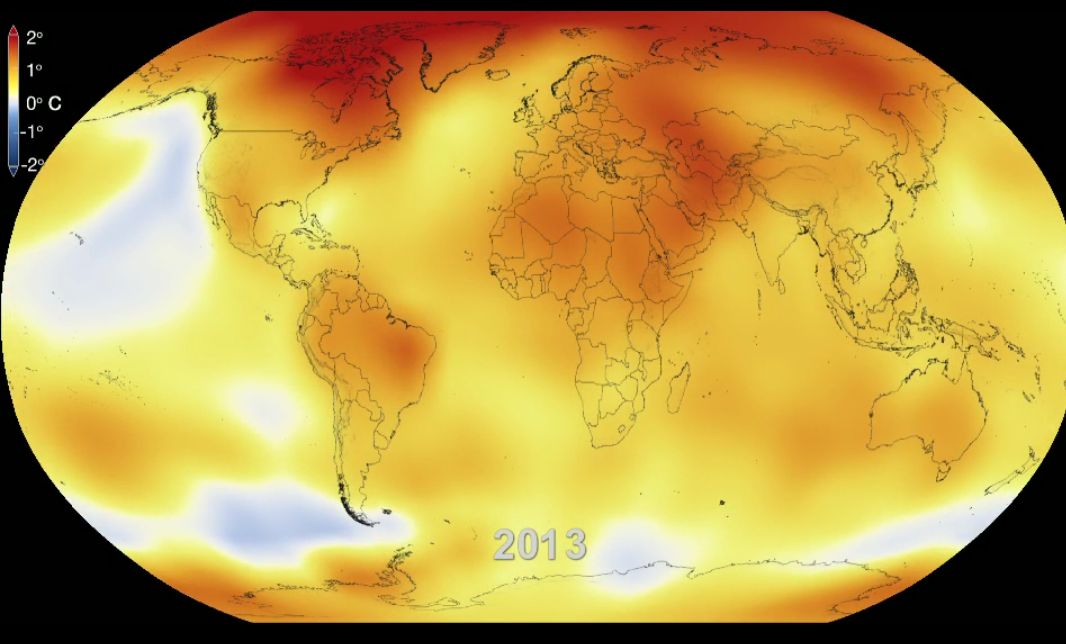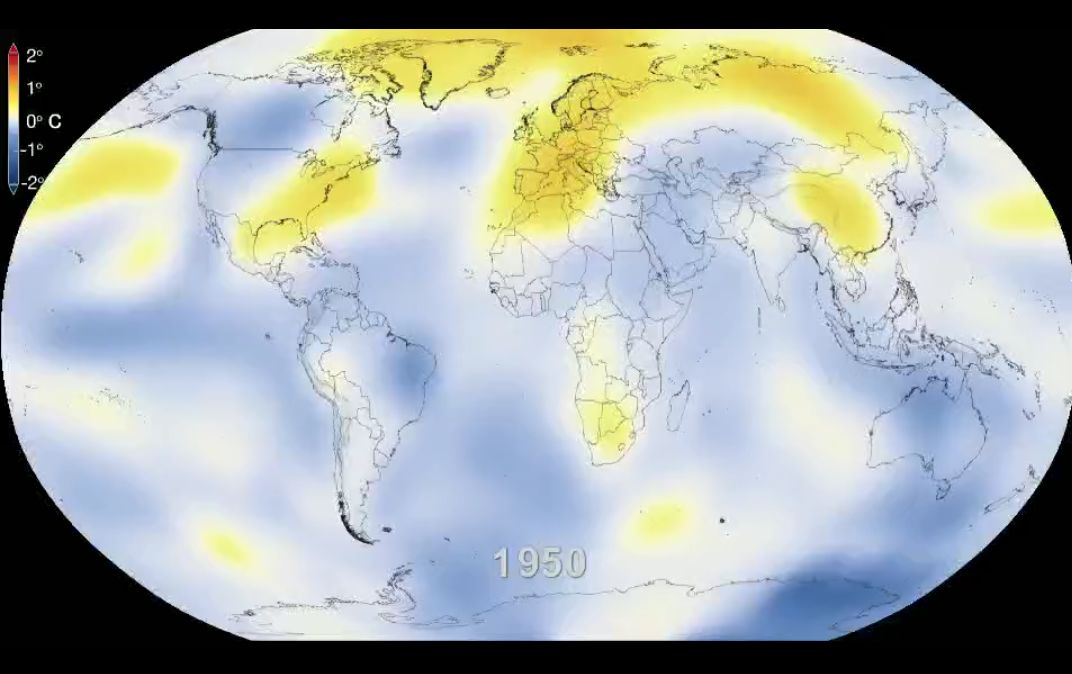 这是两张通过颜色变化来展示地球从1950年到2013年的温度变化图。以1950年的平均气温为基线,黄色和红色表示高于平均气温,蓝色表示低于平均气温。
