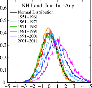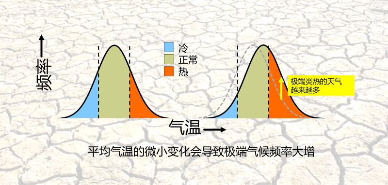 下图显示的是温高频率的分布图,可以代表任何一个地方的温高频率分布状态。左边代表极低温发生的频率,右边代表极高温发生的频率。当平均气温稍微升高一点儿,从图上可以看出,极高气温发生频率就大大增多了。