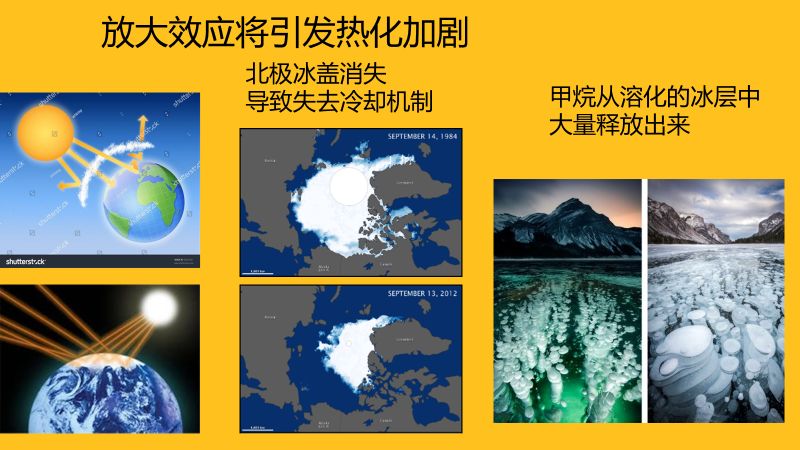 上图是解释平均气温升高一点所引发的巨大变化。下图是地球温生的实际图示。