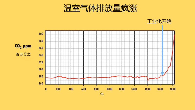然后,工业化时代开始了,大气中的二氧化碳开始上升,而最近几年,以迅猛的速度增涨,以几数倍的速率在增涨。