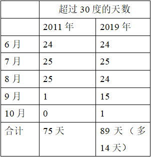 我在网上只能查到2011年到2019年的历史气温记录。我翻看了北京的气温,板着指头数了一下,2011年夏天,气温超过30度的天数有75天,而2019年有89天。2011年,9月份只有1天的气温超过30度,而2019年,有15天的气温超过30度。2011年6到10月最高气温平均值27.66度,2019年为28.82度,相差1.16度。