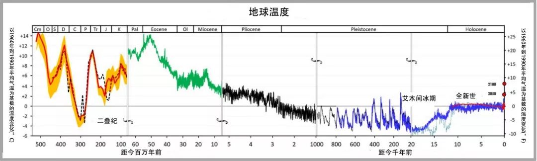 这是一张地球5亿年的气温变化曲线图,这个时间长度足够覆盖地球上开始出现复杂生命形式的时期。这条绿线代表的是1960年到1990年的平均气温。可以看到,在过去的11000年间,在人类文明孕育和发展的过程中,我们的气温是非常非常稳定的,这一时期被称为:全新世。气温非常温和,极地有冰,赤道很炎热,地球的大部分地区适宜居住。因此,我们可以进行农业生产,可以建设城市,人类繁衍和迁移,覆盖了整个地球。