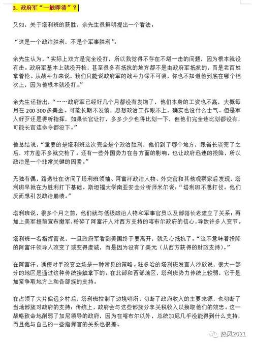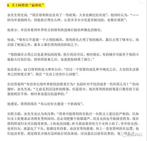 在我们看来,余先生不仅实际,甚至懂得一点阶级分析;他所反映的这些情况,比一百篇夸夸其谈的意识形态审判式的“宣言”,比自由派公知嚎叫一百遍“阿富汗完了”都要强。(当然,弄清楚当前阿富汗社会情况还需要更细致的、真正的阶级分析。)