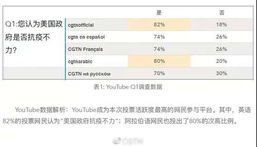 CGTN民调的第一个问题是“您认为美国政府是否抗疫不力?”,81.7%的网民认为美国政府抗疫不力,许多网民还留下尖锐的评论,直斥美国政府抗疫失败。