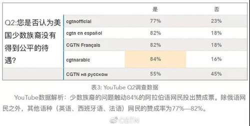 CGTN智库第二个提问,在抗疫中,“您是否认为美国少数族裔没有得到公平的待遇?”全球网民投出了77%的赞成票。其中阿拉伯语网民的反响最为强烈,在推特平台上认为不公平的阿语网民高达81%,优兔平台上更高达84%。