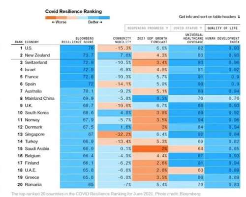 当时,无论调查结果还是指标设置,彭博社这一调查都成为笑柄。本应潜身缩首,低调处事,避避风头,可没想到一个月后,彭博社居然顶风又发出一期“全球抗疫排名”,这次好歹没有“美国优先”,但美国在榜单上仍然高举第五,而中国的排名甚至还下滑了一位……