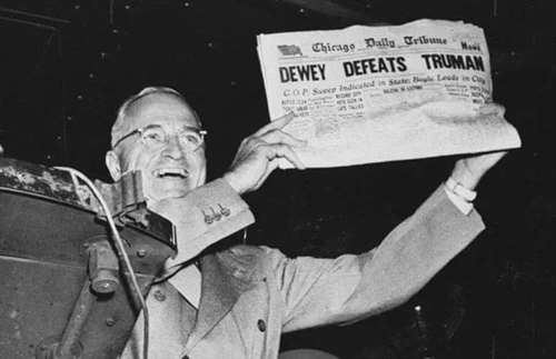 1948年美国大选中,共和党人汤姆斯·杜威在民调中一路领先民主党人杜鲁门,《芝加哥论坛报》没等结果出来,就印刷了第二天报纸,头条为“杜威击败杜鲁门”。