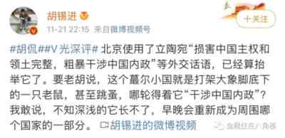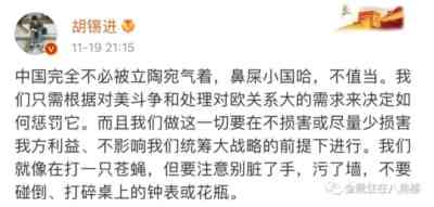 2021年11月19日,立陶宛反华事端正憨,胡锡进跳出来发了一条微博:“中国完全不必被立陶宛气着,鼻屎小国哈”;