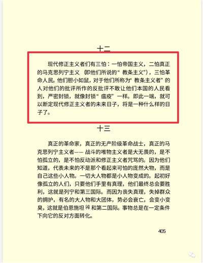 比如:“现代修正主义者有三怕:一怕帝国主义,二怕真正的马克思列宁主义(即他们所说的‘教条主义’),三怕革命人民。”