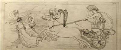约翰·弗拉克斯曼(John Flaxman)于1793年为荷马史诗《伊利亚特》(Ilias)所绘制的插图。画中描述在时序三女神的引路下,赫拉与雅典娜驾着战车下降凡间,直奔战场。
