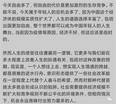 老实说,我也不认为莫言先生的“大风”论是在鼓励年轻人给资本家卖命;我更多感觉“不要被大风吹倒”是一种“凄凄惨惨戚戚”,意思是你们年轻人虽然被资本压榨成这样,但是,也不要太消极呀。我更多是这种感觉。因此,我更愿意把莫言先生这碗鸡汤,不是理解为馊了的,而是没啥味道的,比起胡锡进那句“机会永远青睐付出努力最多的人”,少了一丝打鸡血的快感。