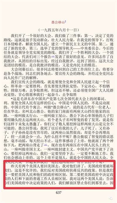 必须牢牢坚持毛主席在《愚公移山》中提出的“两个区别”正确思想,即“第一要把美国人民和他们的政府相区别,第二要把美国政府中决定政策的人们和下面的普通工作人员相区别”。
