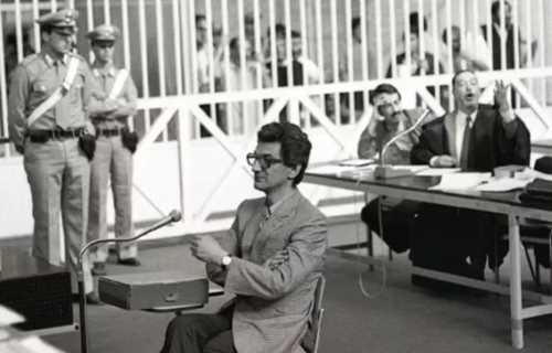 审判庭上的奈格里。安东尼奥•奈格里(Antonio Negri),当代意大利马克思主义理论家。他在1979年被捕入狱,囚禁4年后,于1983年流亡法国。1997年返回意大利,继续囚徒生活,直到2003年,他才完成所有司法手续,从束缚中解脱出来。