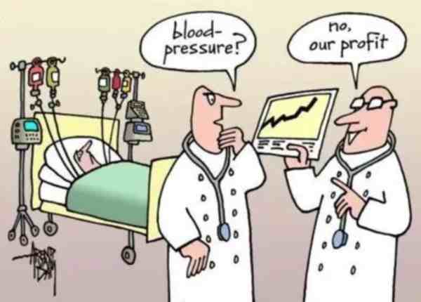 虽然救死扶伤是医院和医生的天职,但公立医院和私立医院履行救死扶伤职责是有本质区别的。公立医院代表政府履行为国民健康服务职能,属于公益性事业,而非营利性组织。这就决定了医生和医院在收治病人行医看病时考虑的是治病救人,而不考虑赚钱盈利。私立医院由资本家投资首先考虑的是资本回报、赚钱赢利,通行的是利润至上原则。以药养医、治病赚钱、卖药盈利便成了私立医院的生存之道、生财之道、经营目的。这就致使中低收入劳动者看不起病、住不起院,疾病得不到及时有效治疗。在一些私立医院经常做无关检查、输液,一个轻微感冒也要开上几百甚至上千元药费,加重了病人的医疗负担,造成看病贵、看病难、治不起病的严重社会问题。另一方面,医护人员为了完成医院盈利指标和增加个人收入也难免小病大治、开大处方,过度用药、过度治疗、过度检查,对有钱患者关爱有加开贵重药,对低收入患者冷若冰霜甚至拒之门外,现实生活中医生见死不救、因钱不到位终止手术的不人道行为时有发生,严重扭曲了医护人员行医职责和医德仁心。