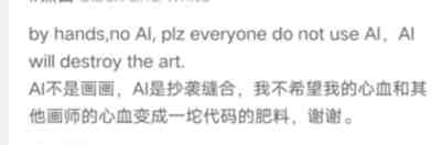 近两天,当我闲暇时刷微博知乎看社交媒体的时候,总是能看到AI作画的争论,我甚至看到这么一张图,上面写着“by hands ,no AI ,plz everyone do not use AI, Ai will destroy the art.”简单翻译过来就是不要用AI, AI会毁了艺术。
