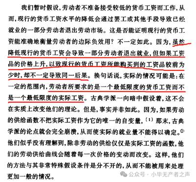 凯恩斯高声呼吁资本家们:劳动者所要的是一个最低的货币工资而不是实际工资,所以我们就让他们实现最低货币工资的美梦吧,我们只需要小小的提高工资品的价格,就足以让他们的实际工资回到我们需要的地步,我们只需要让面粉,汽油和化肥的价格上涨10%,就能让劳动者等额的工资缩水将近10%,这就是凯恩斯幽默的解决方案,一个没有忤逆资本增殖本性,和完全服务于资产阶级,却有效的迷惑了无产阶级的障眼法。